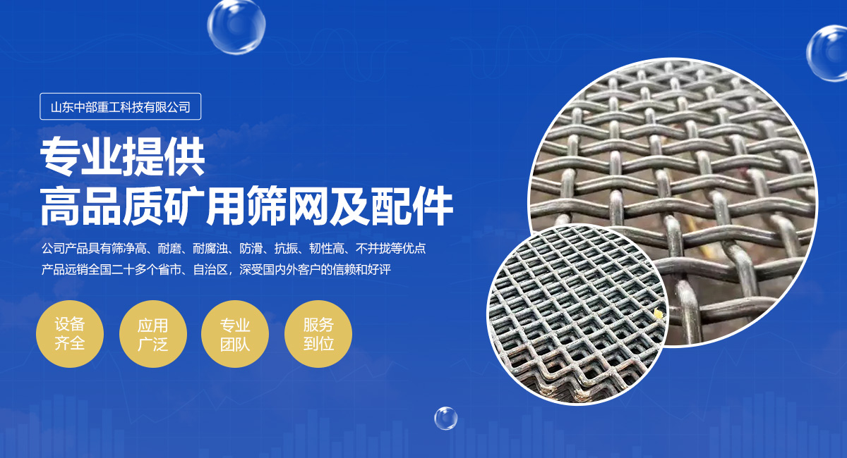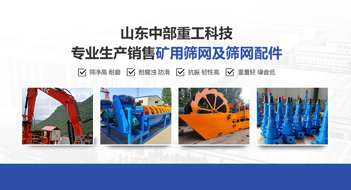 山东中部重工科技有限公司目前拥有国内优良的技术团队,研发生产各 种筛分设备、给料机、破碎机、振动筛机、破碎锤、各种洗砂机、脱水筛等 矿山机械及周边配件。并有先进的现代化筛网生产线设备。公司生产的产品 主要有:聚氨酯筛网、聚氨酯脱水筛网、聚氨酯高频筛网、锰钢编织筛网、 钢板冲孔网、焊接筛网等各种编织筛网。